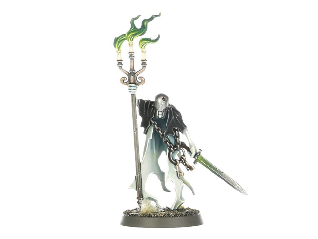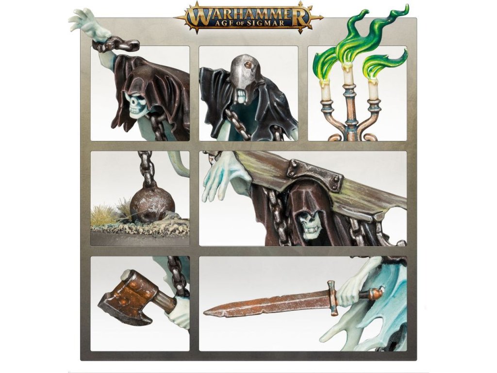 As with many Nighthaunt, the Chainrasp Hordes are little more than wisps of ethereal form willed into reality by sheer force of hatred. Each of these models is essentially a floating hooded cloak, from beneath which a twisted skull-face glares; hung variously from each models’ neck and arms is a heavy length of chain ending in an iron weight, a symbol of their deviant criminal history in life (1 model even has his wrist bound in stocks…) They are armed with malignant weapons – swords, axes and spiked maces – and the kit includes options for a Dreadwarden; this is the unit leader, face locked in an iron helm, carrying a large candelabra along with a set of heavy iron keys.