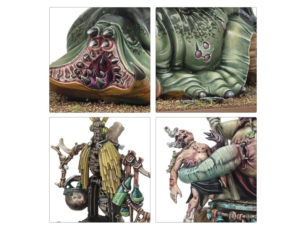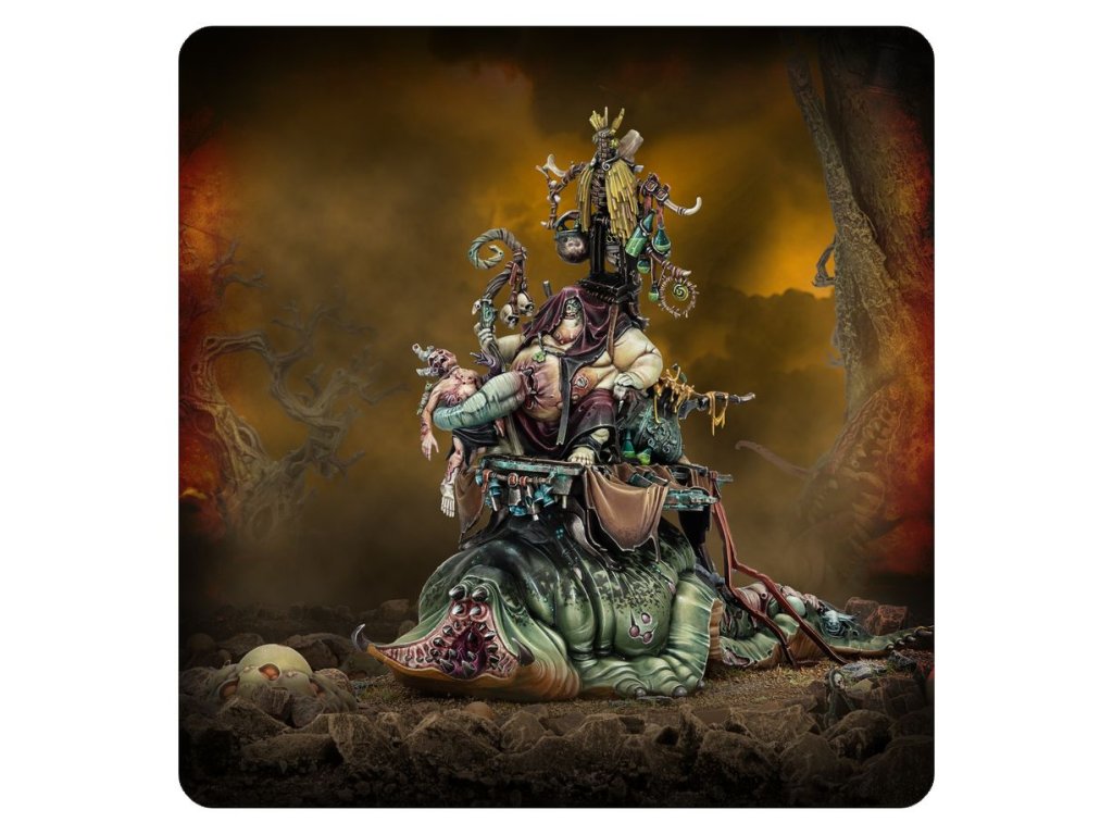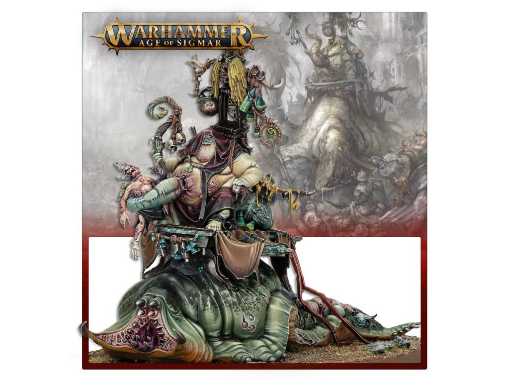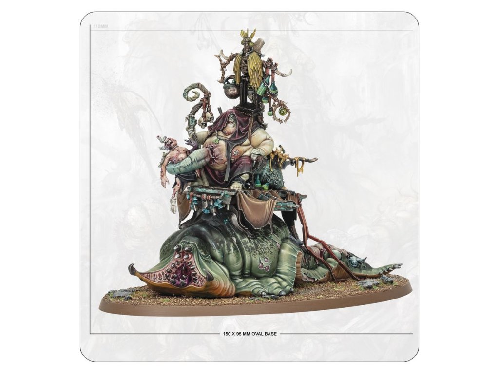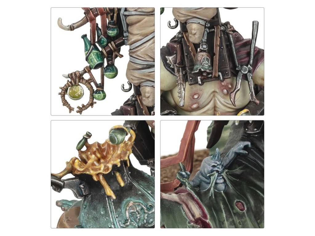 Festus the Leechlord is a heartless maniac, a former plague doctor transformed into a twisted alchemist of disease. His devotion to the Grandfather has seen him swell into a foul Daemon Prince. He leads Nurgle’s armies with infectious enthusiasm on the back of Gathoblyt, relishing the chance to try out new delightful brews on unwilling foes.