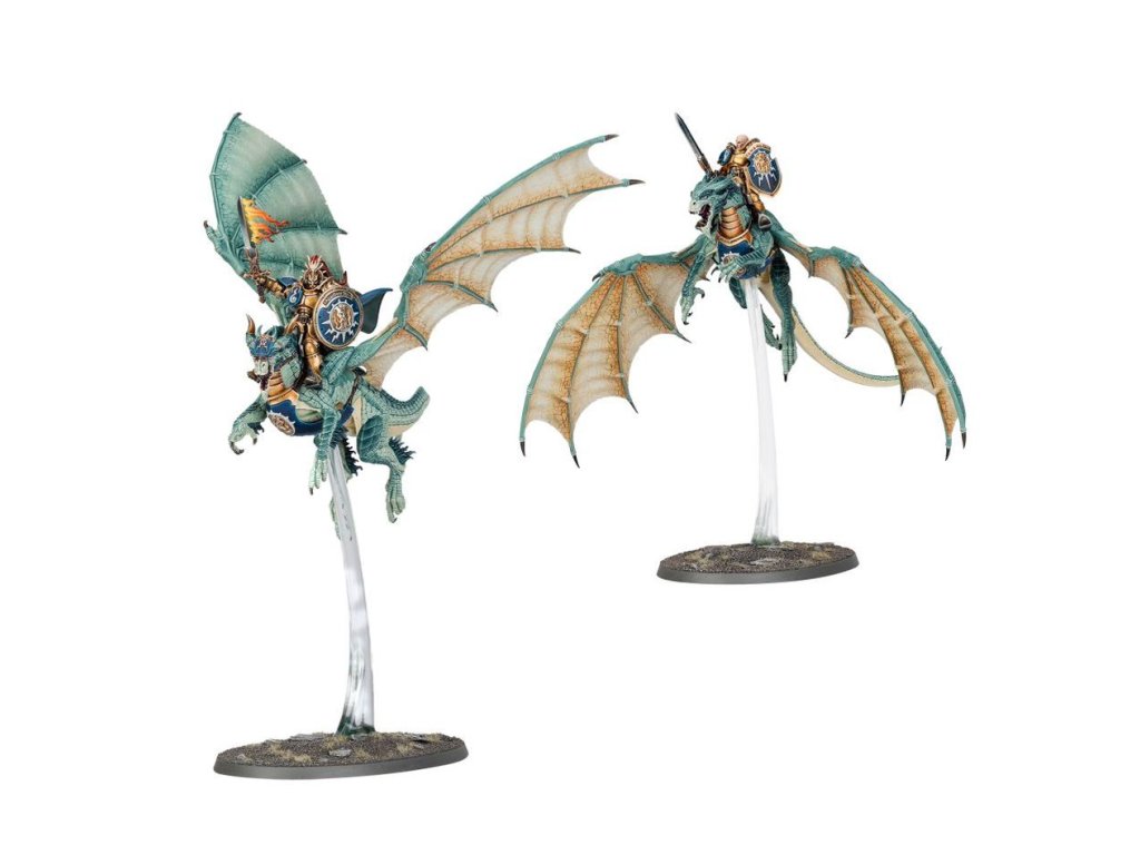 This multipart plastic kit consists of 105 pieces and builds one Knight-Draconis and one Stormdrake Guard in several different poses. It also provides options to construct both as Stormdrake Guard, equipped with either drakerider's lances or warblades. This kit comes supplied with two 105mm Citadel Oval bases and two flying stands, and these miniatures are supplied unpainted and require assembly – we recommend using Citadel Plastic Glue and Citadel paints.