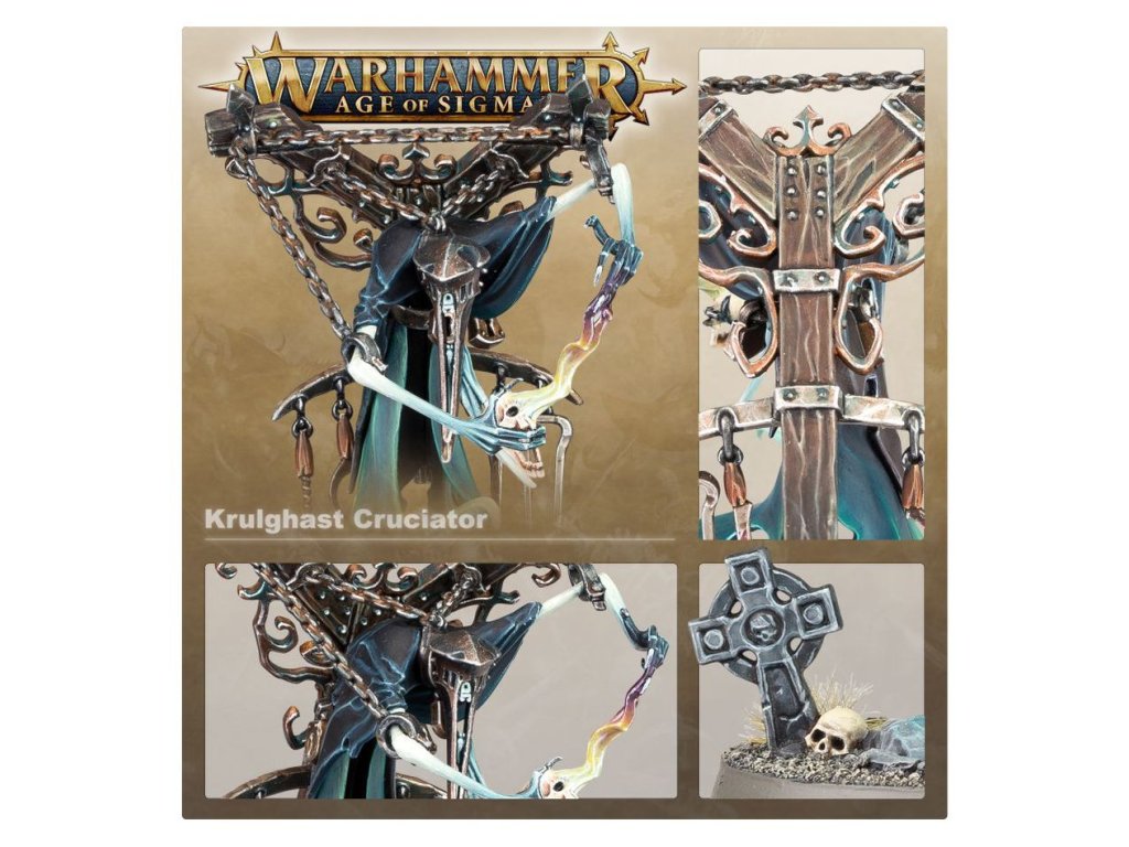 Krulghast Cruciators were once mortals that met a gruesome end on the torture rack. In death, their bitter souls have been twisted by Nagash into ghastly manifestations of torment, replete with instruments of excruciation possessed of a wicked animus.
