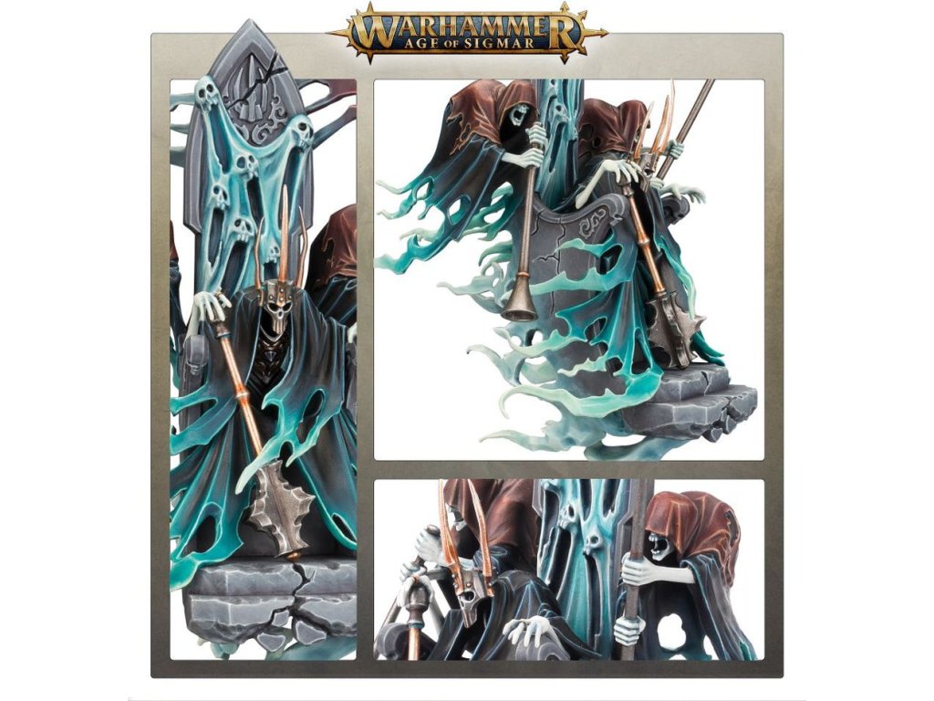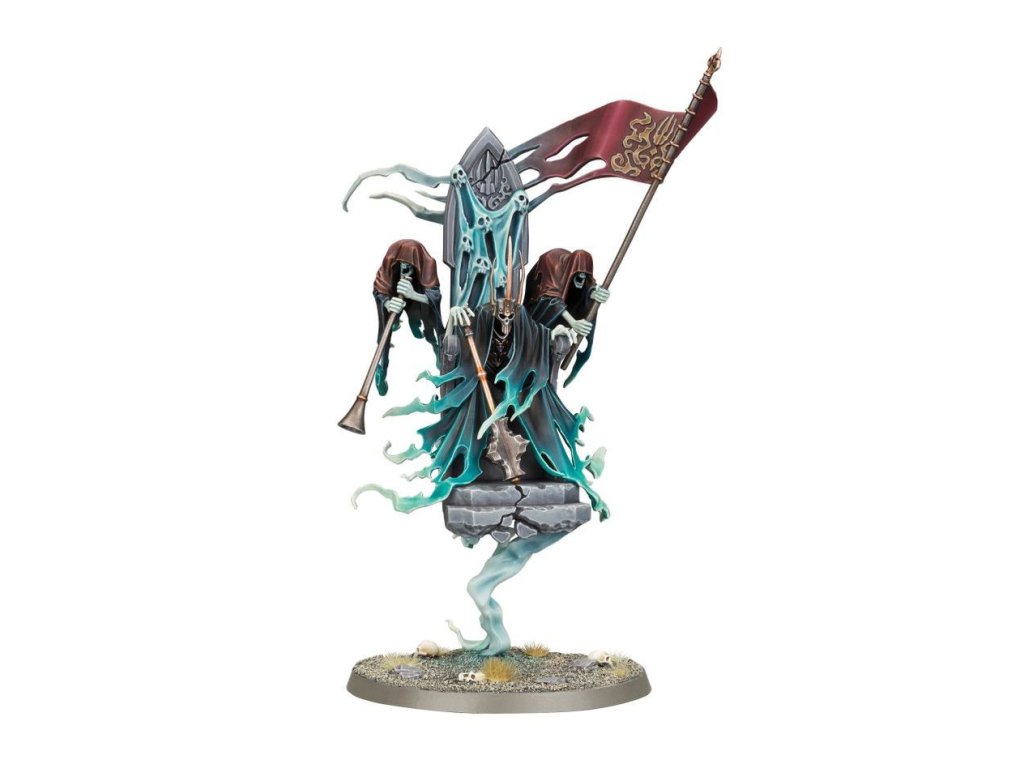 This multi-part plastic kit contains the components necessary to assemble Kurdoss Valentian, the Craven King. Seated silent and unmoving on his cracked, crumbling throne, Kurdoss is a hunched, slumped figure who nonetheless exudes an aura of pure menace, with his sinister, 3-pointed crown entirely enclosing his face in a skull-like mask. One hand clutches the arm of his throne, while the other holds the Sepulchral Sceptre – far from an ornate, bejeweled ceremonial staff, this is a solid weapon designed to crack open the skulls of those who rouse Kurdoss’ fury. Flanking him on either side are his accompanying Wraith Heralds, who are bound to him eternally – one as a banner-bearer, the other carrying a trumpet. The twisted forms of tormented souls rise high above Kurdoss, and the whole miniature is borne aloft on a swirling column of ethereal energy which attaches to the base.