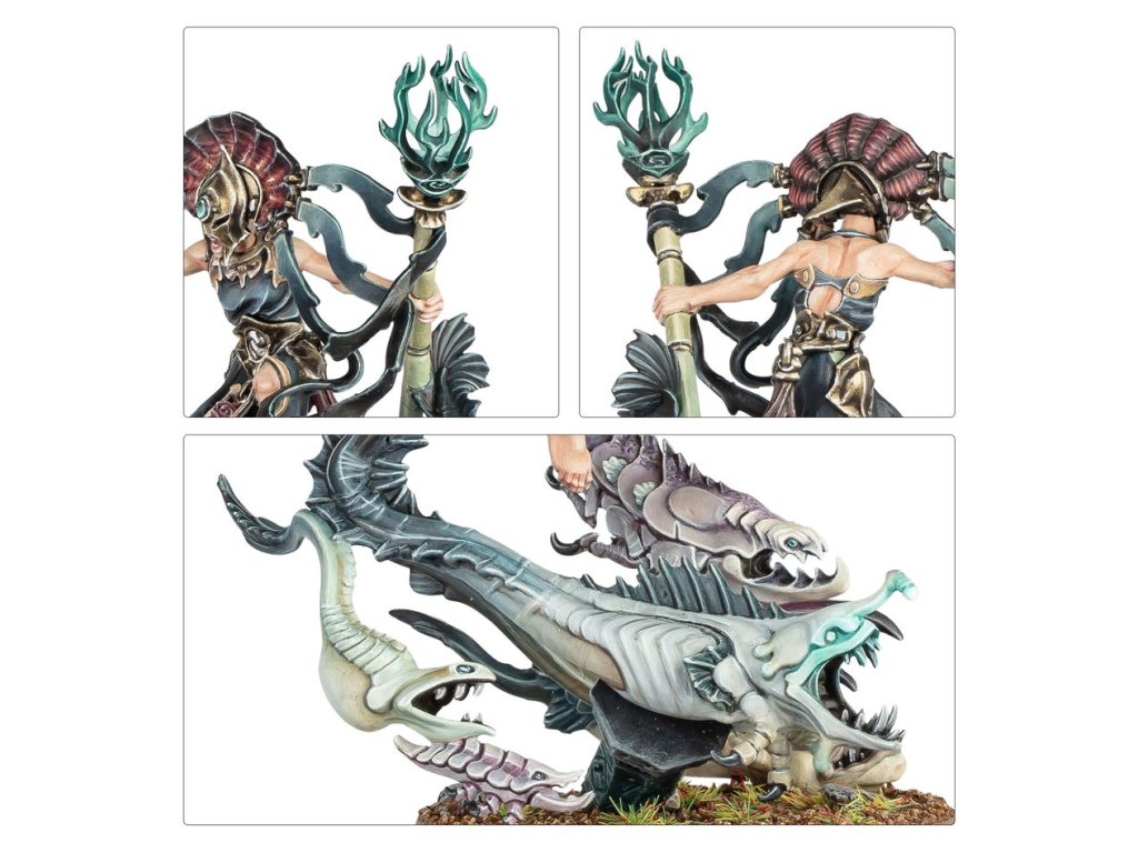 Mathaela, Oracle of the Abyss, is mysterious and terrifying, rising from their lightless domain only when the existence of the Deepkin is threatened. Wielding the crushing magic of the deepest ocean planes, they annihilate the Idoneth’s foes and stir the realmseas into violent motion.