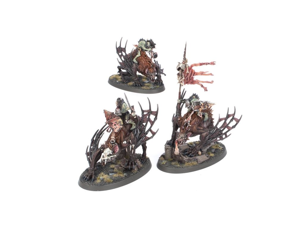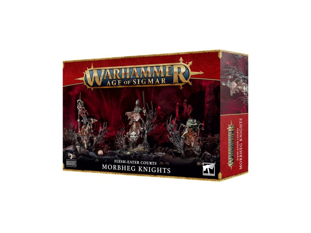 This multipart plastic kit builds three Morbheg Knights, the nightmarish leather-winged cavalry of the Flesh-eater Courts. These ghoulish outriders swoop across the battlefield at terrifying speeds, charging down foes with grisly lances before their foul nightshrieker mounts tear apart any survivors. You'll also find components to build a hornblower musician, a standard bearer waving a flag of flayed skin, and a Champion of Morbheg with uniquely grisly headgear, a skull-helmed nightshrieker, and a knightly sword.