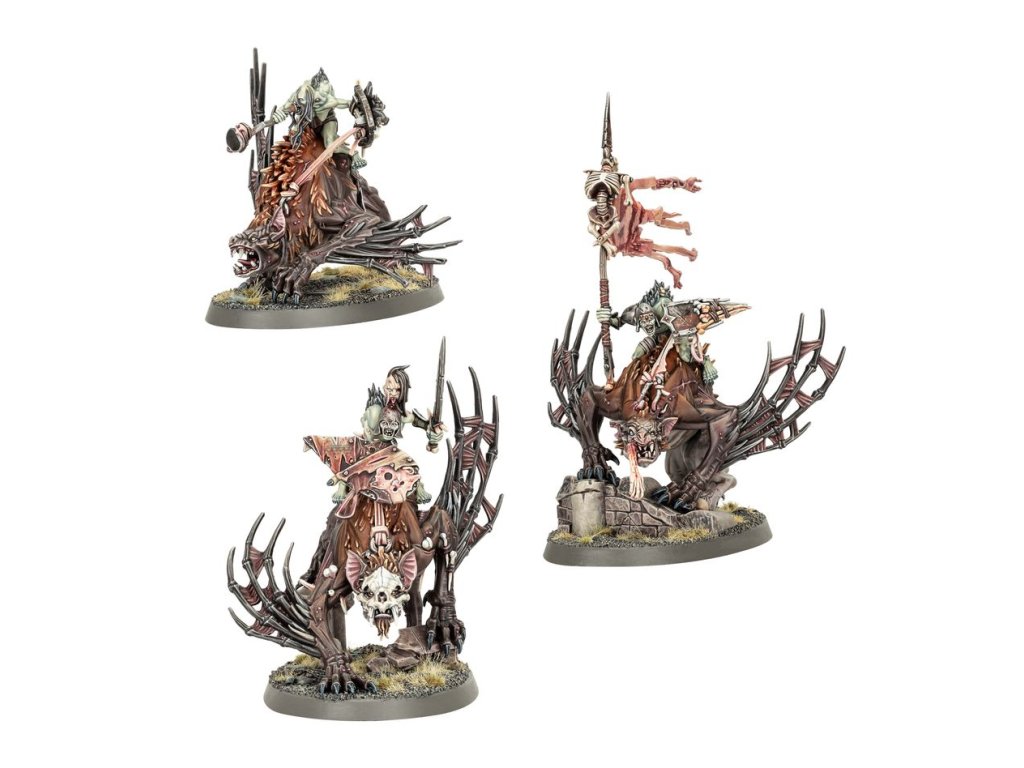 The kit offers plenty of interchangeable cosmetic options to help ensure your cannibal cavaliers look unique on the battlefield – including five bat heads for the nightshriekers, eight heads for the ghouls, and six different shields decorated with bones, flayed skin, and other gruesome trophies.
