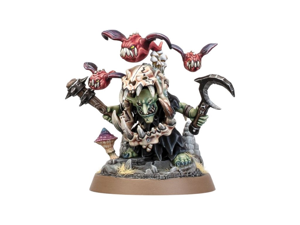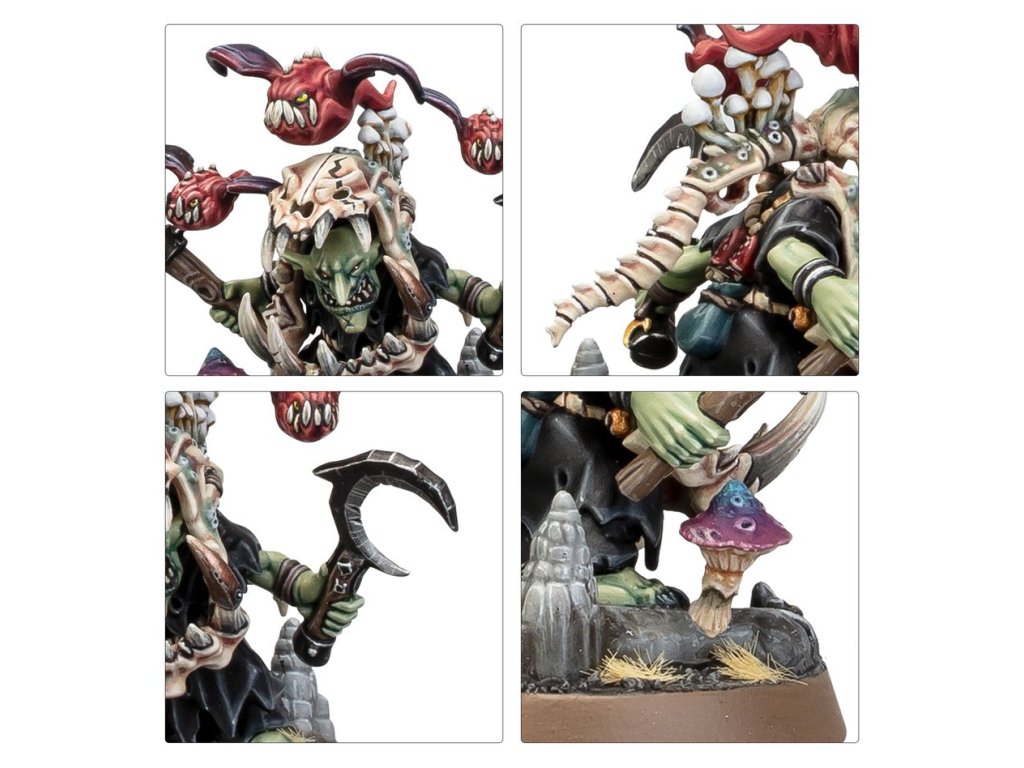 This multipart plastic kit builds a Rabble-Rowza, a Moonclan demagogue for the Gloomspite Gitz. Protected by his fearsome squig-skull armour, this noisy leader whips cave-dwelling monsters into a frothing frenzy. Should any foes get too close, the Rabble-Rowza lashes out with a moon-sickle and basha, whilst their screeching flock of mushroom-stuffed bat squigs dive-bomb enemies in explosive fashion.
