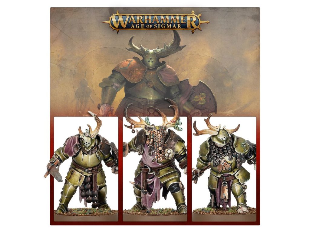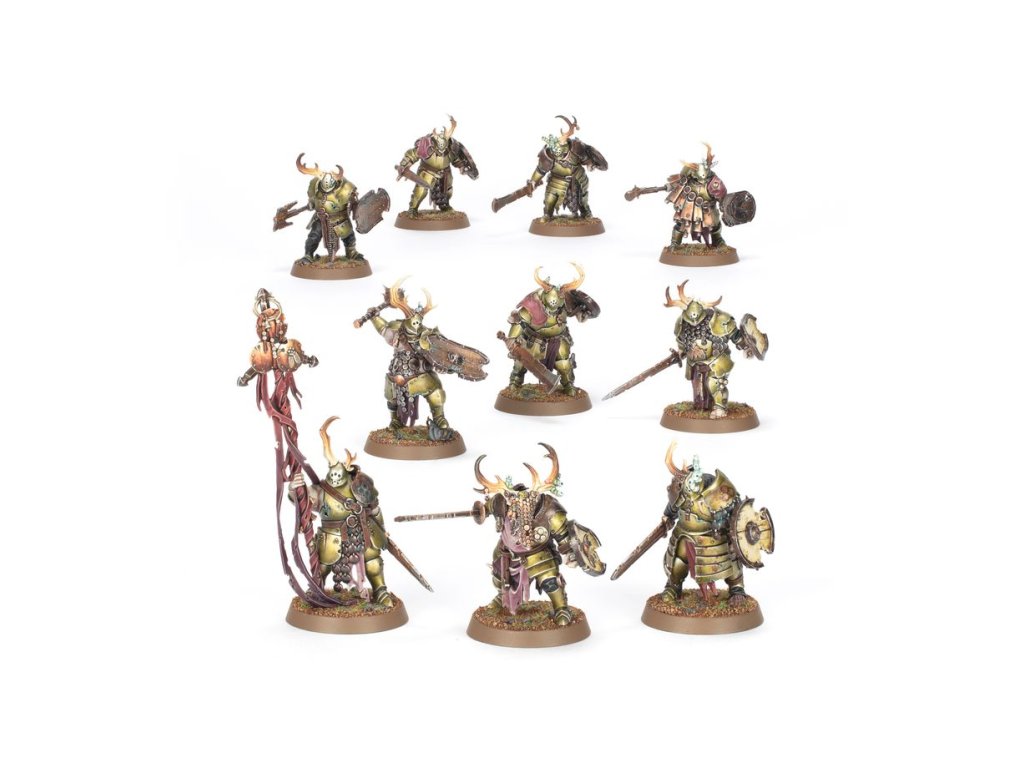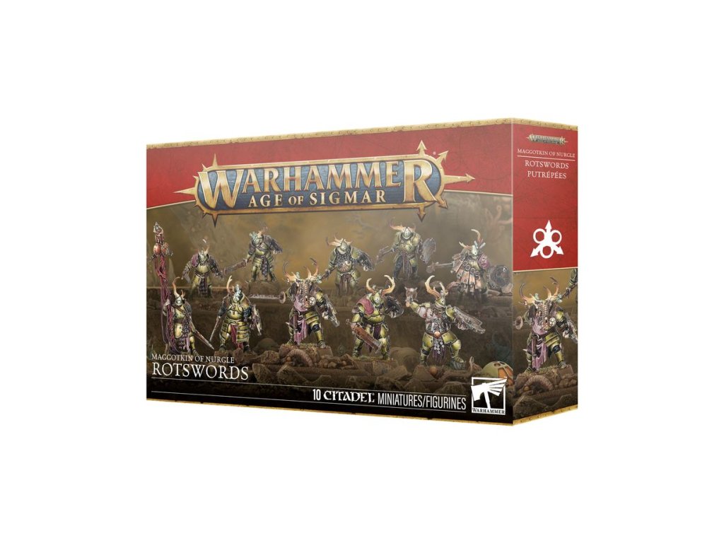 This multipart plastic kit builds 10 Rotswords, heavily armoured mortal infantry for your Maggotkin of Nurgle armies in games of Warhammer Age of Sigmar. Clad in thick plates of rusting metal, they are difficult to take down, making them especially effective at holding objectives. Each Rotsword can be equipped with a pair of deadly, ruined master-crafted weapons or a weapon and a shield. The right-handed weapons and left-handed shields are interchangeable across the miniatures, as are the 12 heads in the kit, making it easy to customise your unit. There are also parts to build an optional champion, musician, and standard bearer with a choice of two banner toppers.
