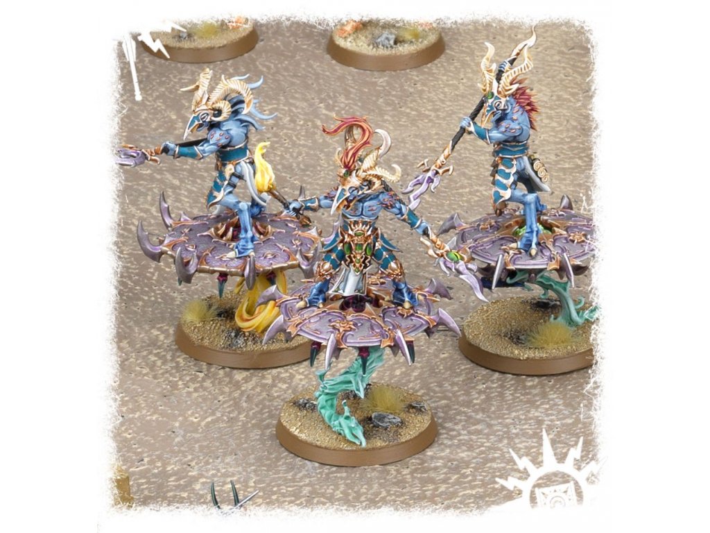 Tzaangor Enlightened are arrogant creatures who can see the lessons of the past as easily as mortals see daylight. Some even soar into battle atop the bizarre bladed constructs known as Discs of Tzeentch, gleefully unnerving foes by cawing out their most terrible failures and sins as they strike with gilded spears.