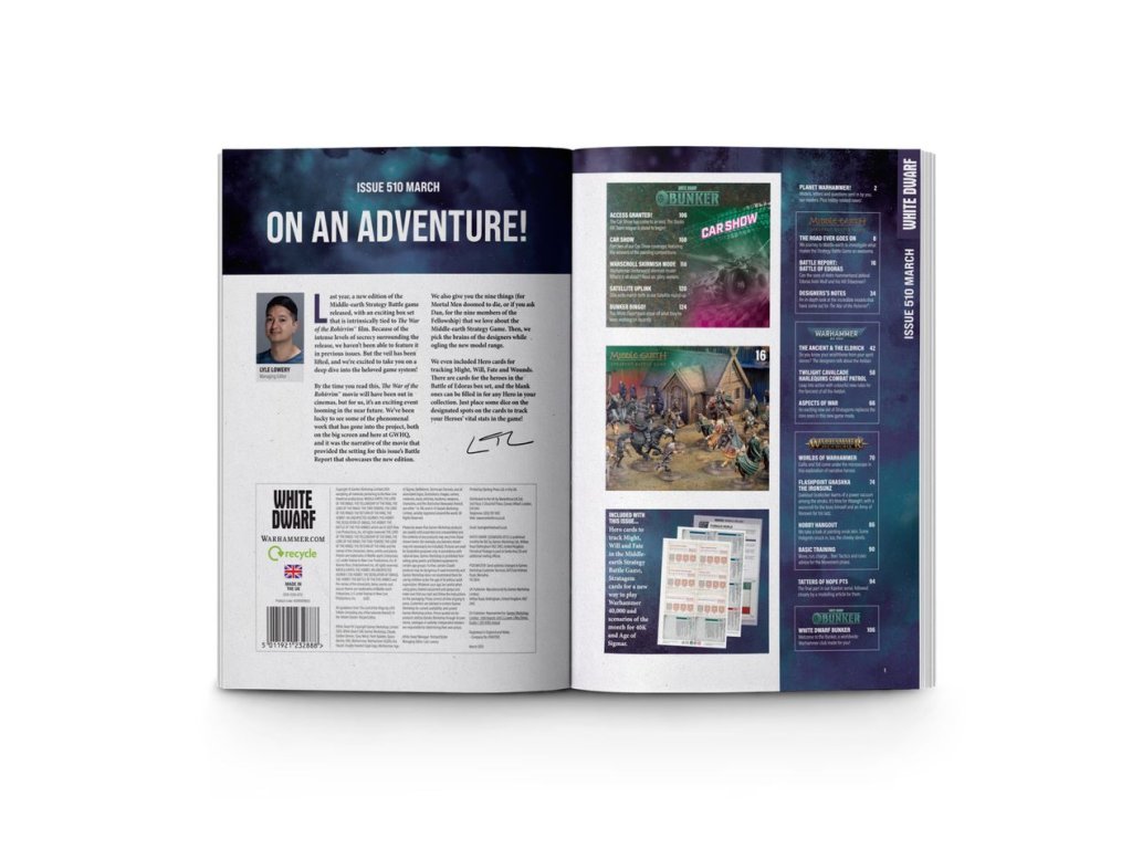 Each copy of White Dwarf 510 also comes with a cardboard insert containing six Hero Cards for the Middle-earth™ Strategy Battle Game, ten Stratagem Cards for Warhammer 40,000, and a card featuring the Warhammer 40,000 and Warhammer Age of Sigmar Scenarios of the Month.