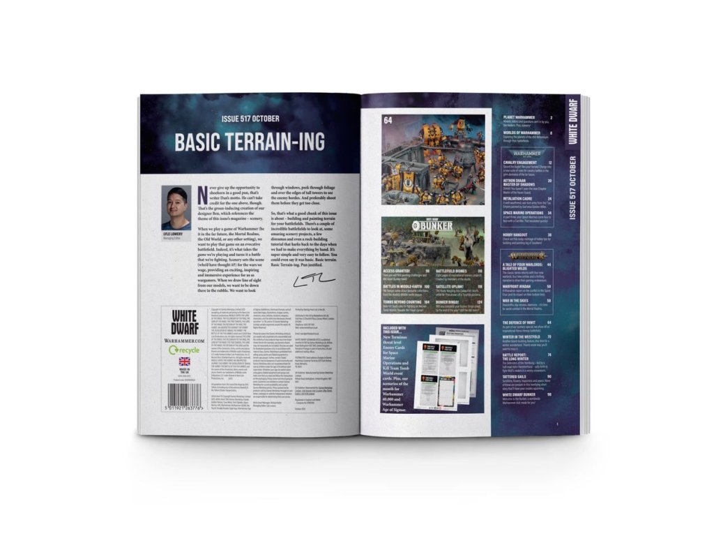 Each copy of White Dwarf 517 also comes with a cardboard insert containing the scenarios of the month for Warhammer 40,000 and Warhammer Age of Sigmar, Terminus threat Level Enemy cards for the Space Marine Operations mini-game, and Kill Team: Tomb World event cards are also included.