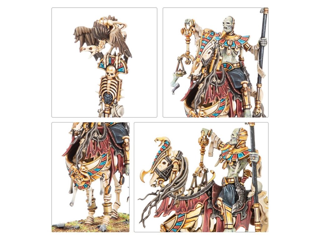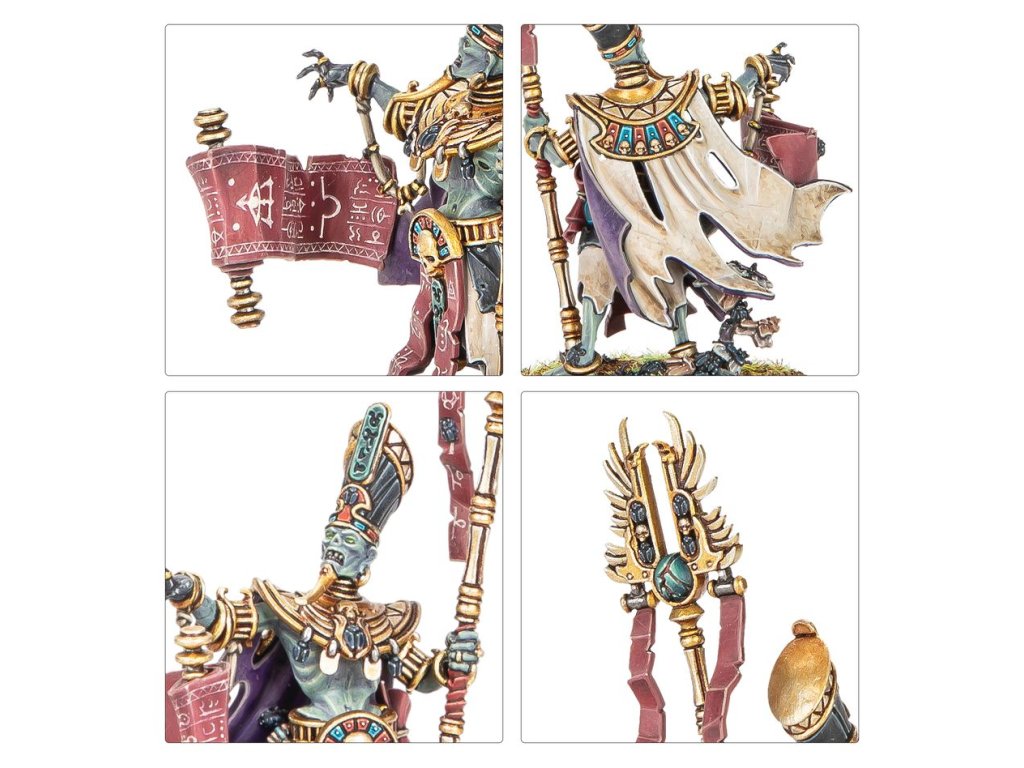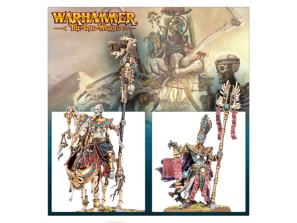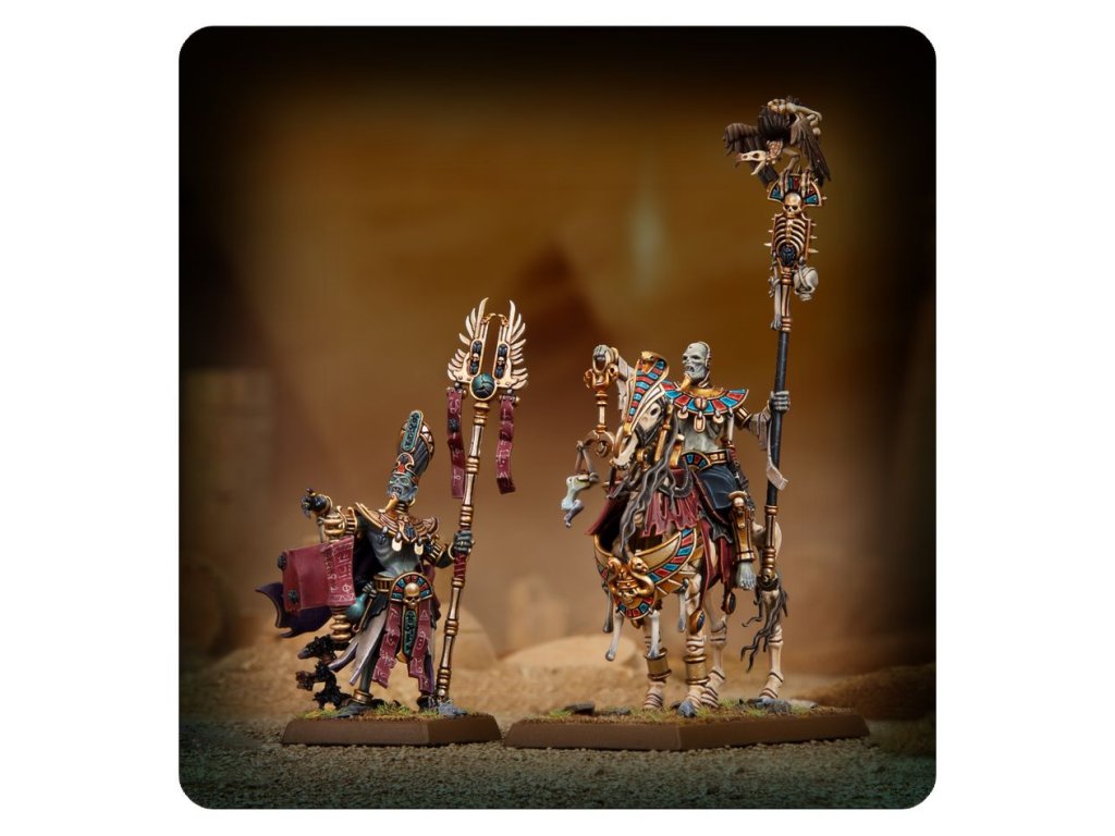 Liche Priests are the undying members of Nehekhara’s Mortuary Cult and holders of the secrets to unlife. They perform the rituals necessary to draw spirits from the Realm of Souls and bind them once more into corporeal bodies, rousing the Tomb Kings and their courts from their slumber, and awakening their armies for war.
