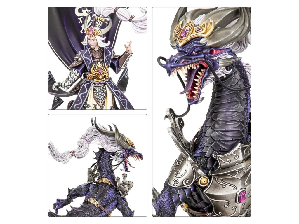 Miao Ying rules over Northern Cathay from her seat of power in Nan-Gau as commander of the armies of the Great Bastion. Cold and aloof even by the standards of a Dragon, Miao Ying has stoically undertaken this most solemn of duties for many centuries, ever since the defence of the northern border was entrusted to her by the Celestial Dragon. Because of the weight of duty she carries and the power she wields, the Storm Dragon is widely considered the favourite of the Celestial Dragon by her many siblings, and Miao Ying lords her position over them, often preferring to stand apart when they gather together.
