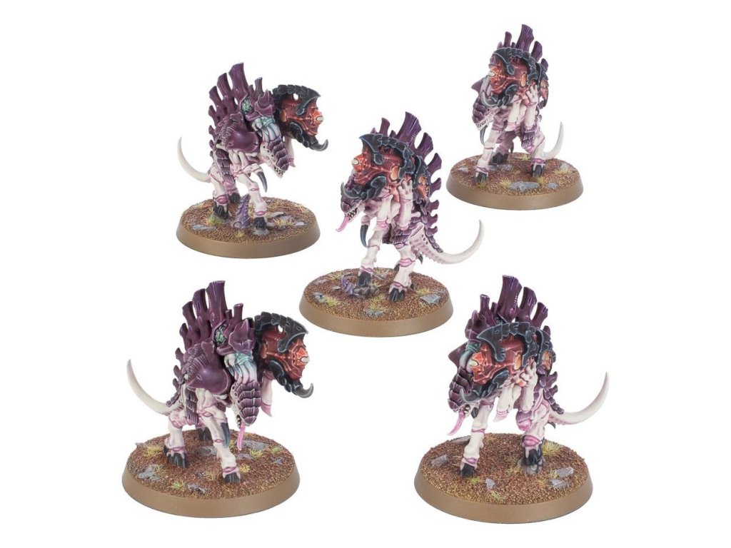 This multipart plastic kit builds five Barbgaunts – Tyranid creatures engineered as biological artillery. Each of these hunched and hulking gaunt-forms is fused to a grotesque barblauncher – five stout limbs serve to support its living weapon or provide a stable firing platform, while the sixth is little more than an atrophied talon. These beasts of burden are controlled by cerebral parasites, fleshy tendrils digging into each Barbgaunt's eyeless skull to direct its organic payload.