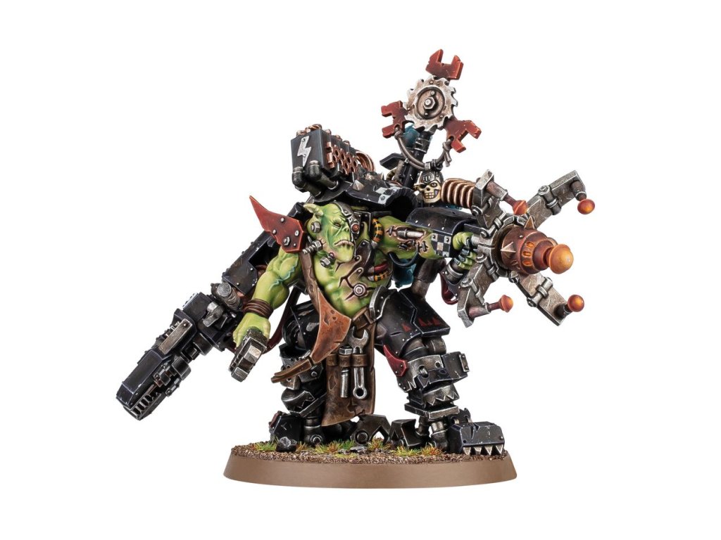 Big Meks are the most ingenious inventors of Ork-kind, who build all sorts of powerful weapons and bizarre devices. They readily bring their favourite contraptions into battle to test them out, even donning self-made bionik exoskeletons to help them carry the biggest gadgets possible. So equipped, a Big Mek can unleash mechanical violence and blasts of energy, or wrenches open warp tunnels through which he and his followers pile into the fight..