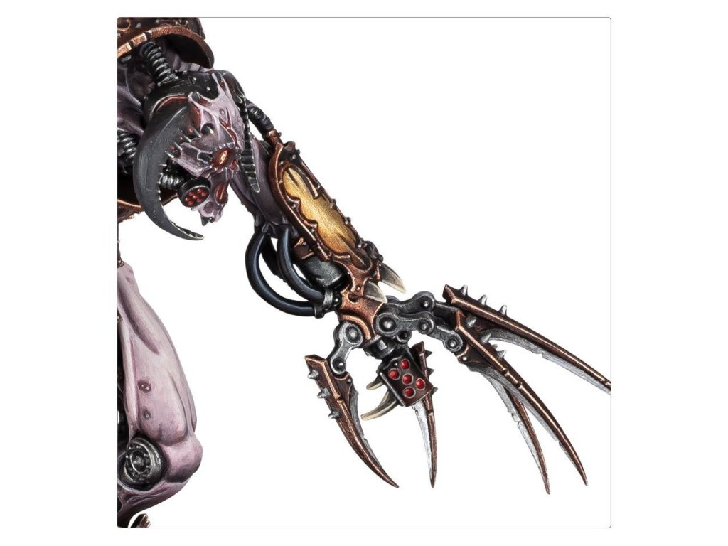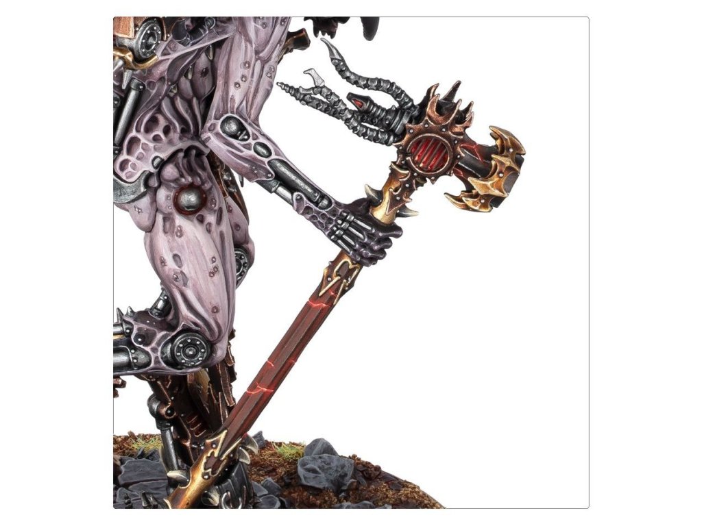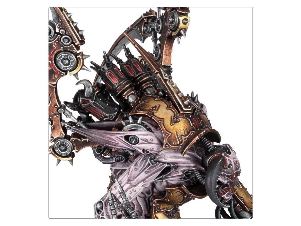 This multipart plastic kit builds Vashtorr the Arkifane, master of daemon forges and manufactorums. This looming, otherworldly figure is covered in sinister cybernetic details – from the daemonic exhausts and chimneys clustered on his hunched back to the mechadendrites that squirm through the rubble of his scenic base. He wields a twisted blacksmith's hammer in one hand, while the other extends into a vicious machine claw with a built-in flame weapon. Vashtorr wears an armoured carapace with a segmented metal apron – he can alternatively be built without this armour, exposing more of the grotesque form beneath.