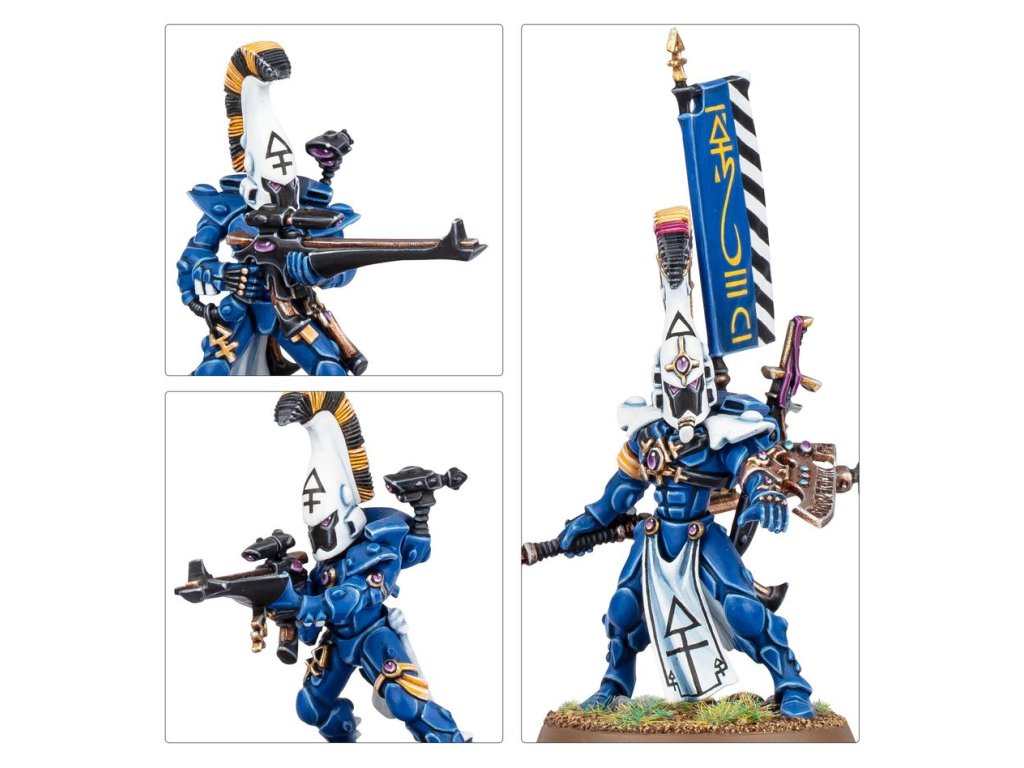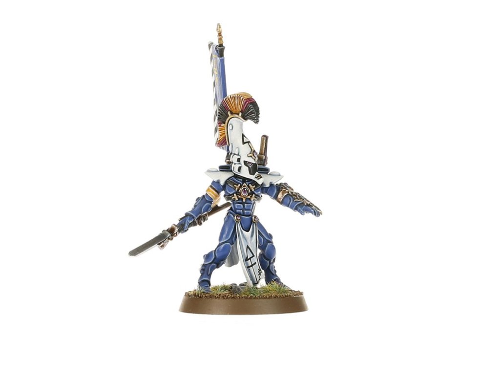 Two of the Dire Avengers can be assembled as an optional Exarch who can be armed with a shuriken catapult, two shuriken catapults, a diresword and a shuriken pistol, or a power weapon and shimmershield. Each Exarch also has an optional back banner, and a choice of two heads – one helmeted and one bare, making it easy to personalise your squad leaders.