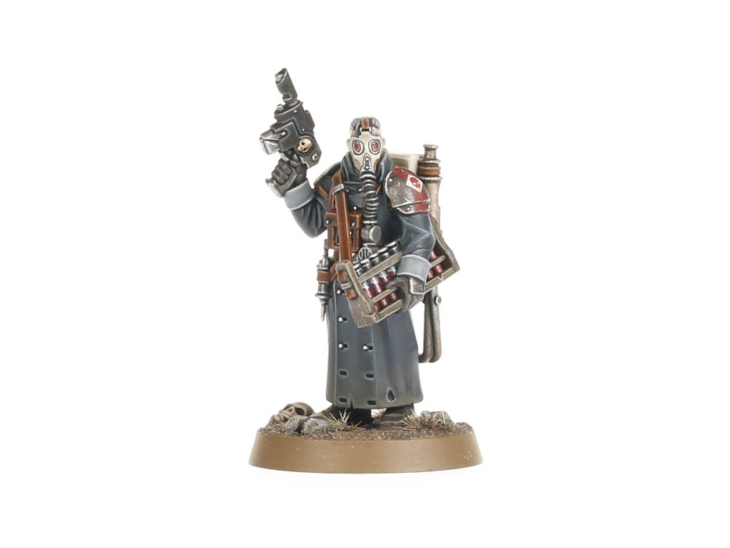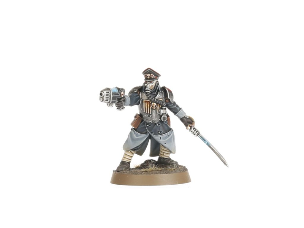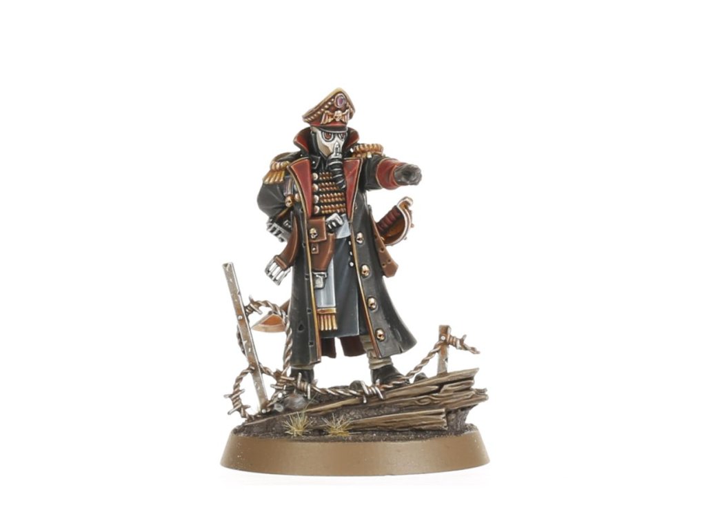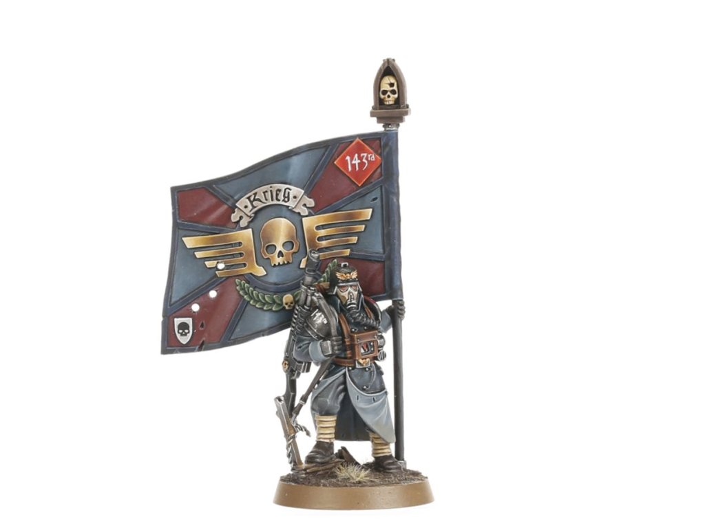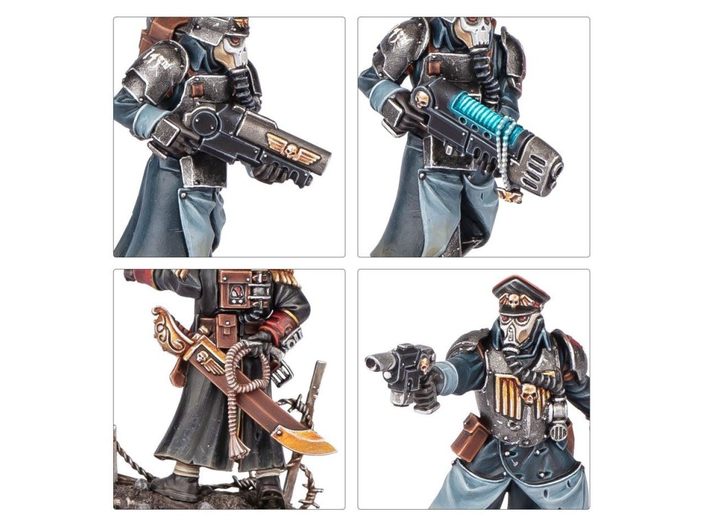 The Lord Commissar in the Command Squad can be equipped with a plasma pistol or a whip in their right arm, and a powerfist or a sheathed power-sword and pointing hand for their other arm. One Veteran Guardsman in the unit may be assembled with either a laspistol, a bolt pistol, or a plasma pistol in their right hand and a chainsword, power weapon, or trench club in their left hand. Another Guardsman can carry a boltgun, plasma gun, meltagun, or grenade launcher into battle. The remaining Guardsmen carry the regimental standard, master vox, and alchemyk counteragents, respectively. There is also a range of optional cosmetic accessories, including shovels, to further decorate your miniatures.
