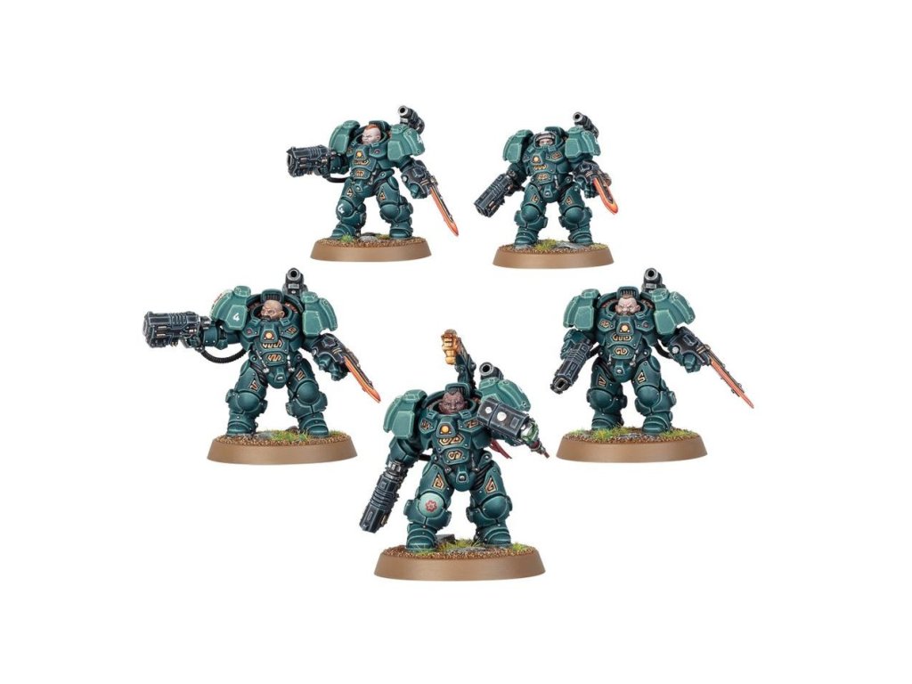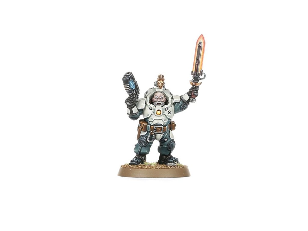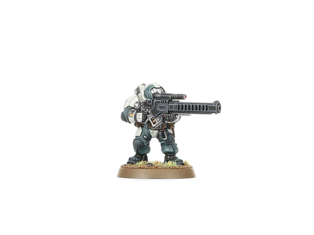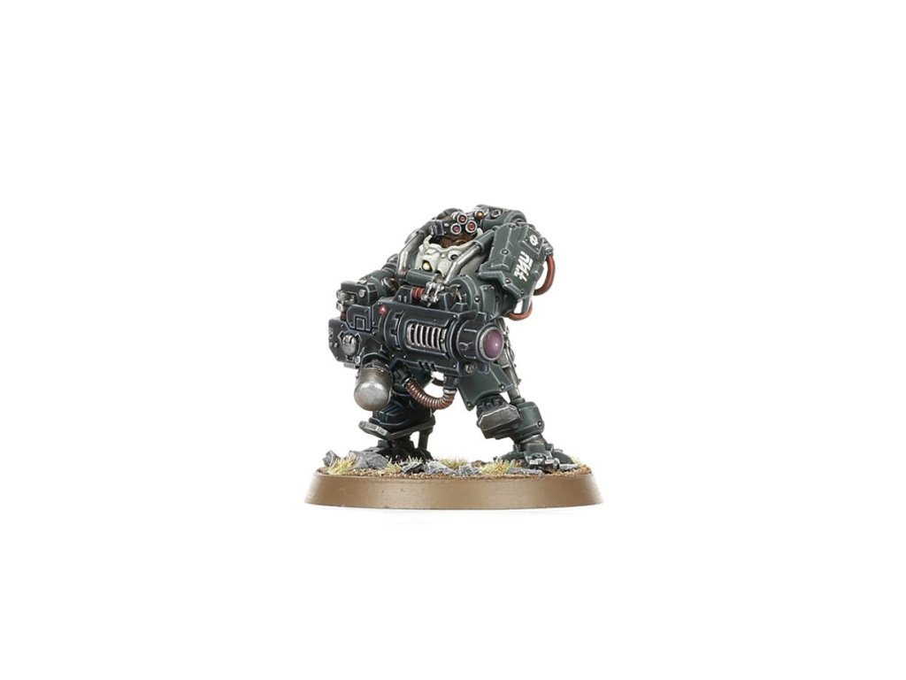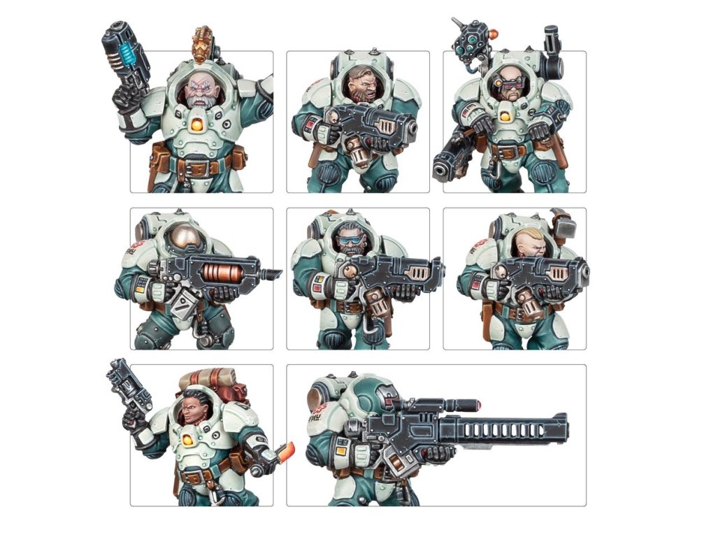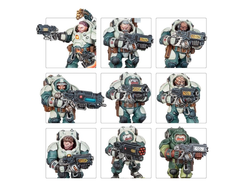 The Einhyr Hearthguard are each equipped with either an EtaCarn plasma gun or volkanite disintegrator, and either a concussion gauntlet or plasma blade gauntlet. There are also parts to build an optional squad leader who can alternatively be armed with a graviton hammer and has a choice of two different crests. There are 19 interchangeable heads, including male, female, and fully closed visors.