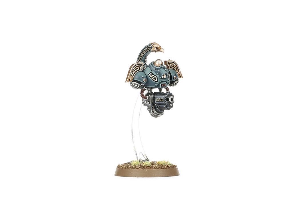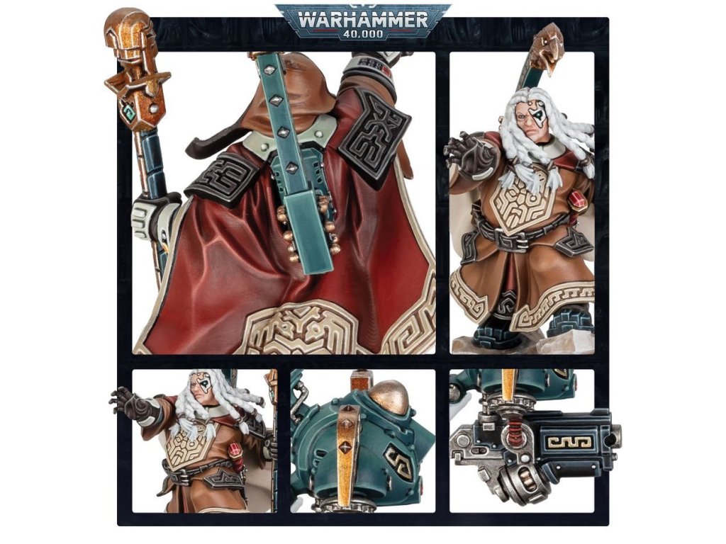 This multipart plastic kit one Grimnyr, a powerful and cunning psyker accompanied by two CORVs. Draped in ornate ceremonial robes and protected by their bird-headed ward crest, this shamanic figure wields an ancestral ward stave capped with a Votannic visage. The kit includes a choice of two heads – one with a beard and mysterious hood, and the other with flowing braids. The rune-marked CORVs that accompany the Grimnyr into battle lend fire support with Autoch-pattern bolters, but also act as conduits to protect them from dangerous surges of empyreal power.