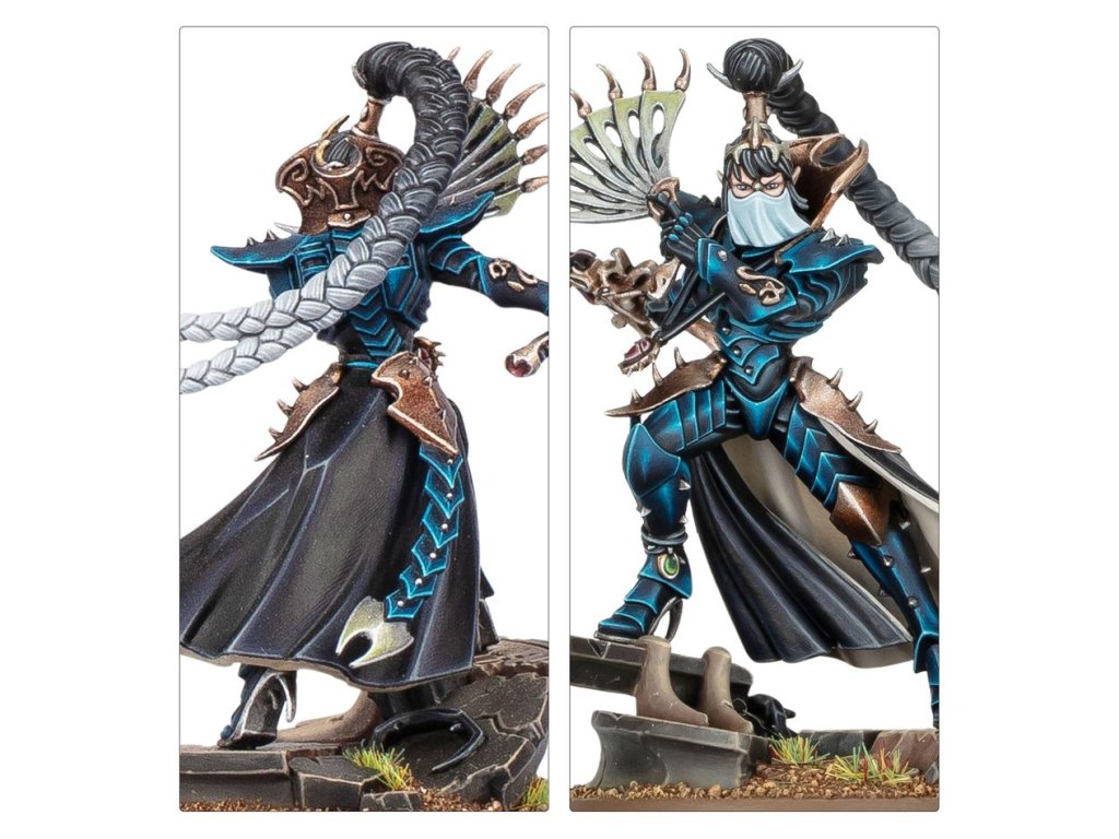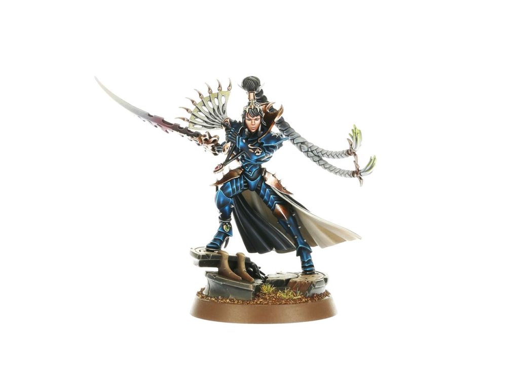This multipart plastic kit builds Lady Malys, a powerful strategic leader for your Drukhari armies in games of Warhammer 40,000. Her tactical brilliance will give you an edge in battle. When deployed to the front lines, there is little her long blade and razor fan can't slice through in melee, unleashing a blinding flurry of blows on her hapless foes. The kit includes two different scenic base toppers and a choice of two different heads – one with a veil and one with an uncovered face, offering a degree of customisation for your expert killer.