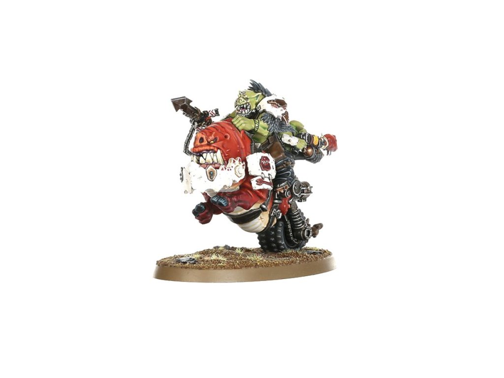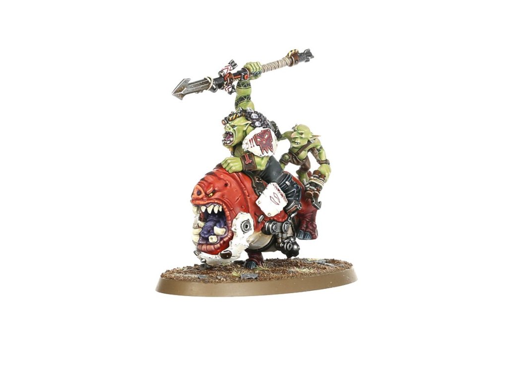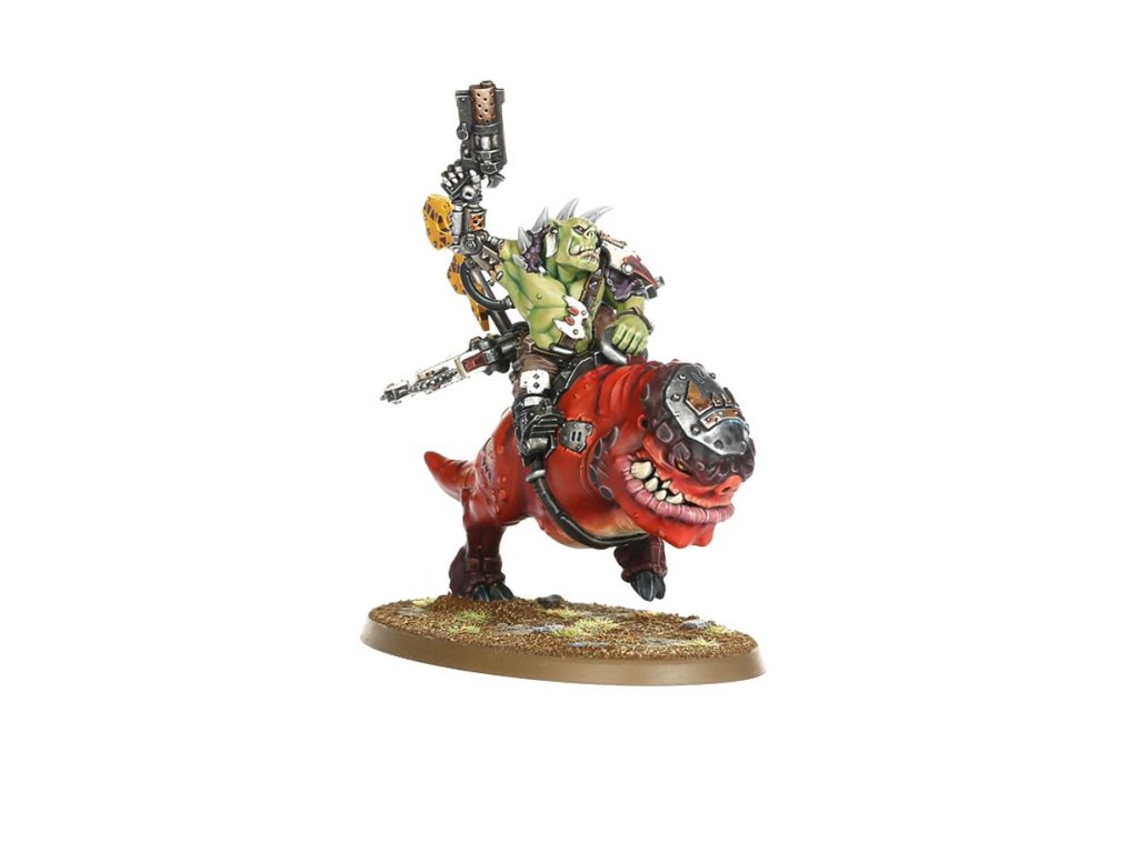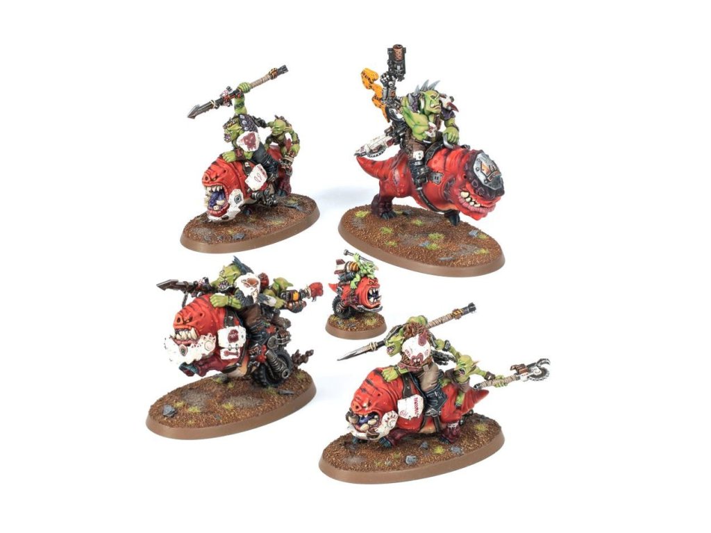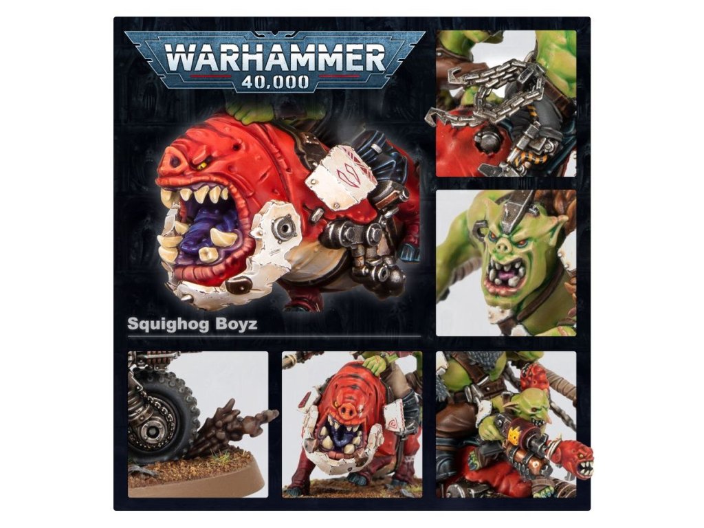 The Squighog Boyz are armed with rokkit-propelled stikkas, and many of their limbs – and those of their mounts – have been replaced with bionic enhancements.