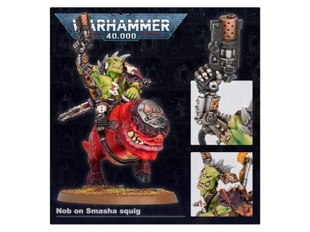 This kit builds one Nob on Smasha Squig, three Squighog Boyz, and one Bomb Squig. The Nob can be built wielding either a slugga or a big choppa, with the other option mounted on the squig's back. Other cosmetic options let you customize your Nob on Smasha Squig with a choice of two heads and two pauldrons.