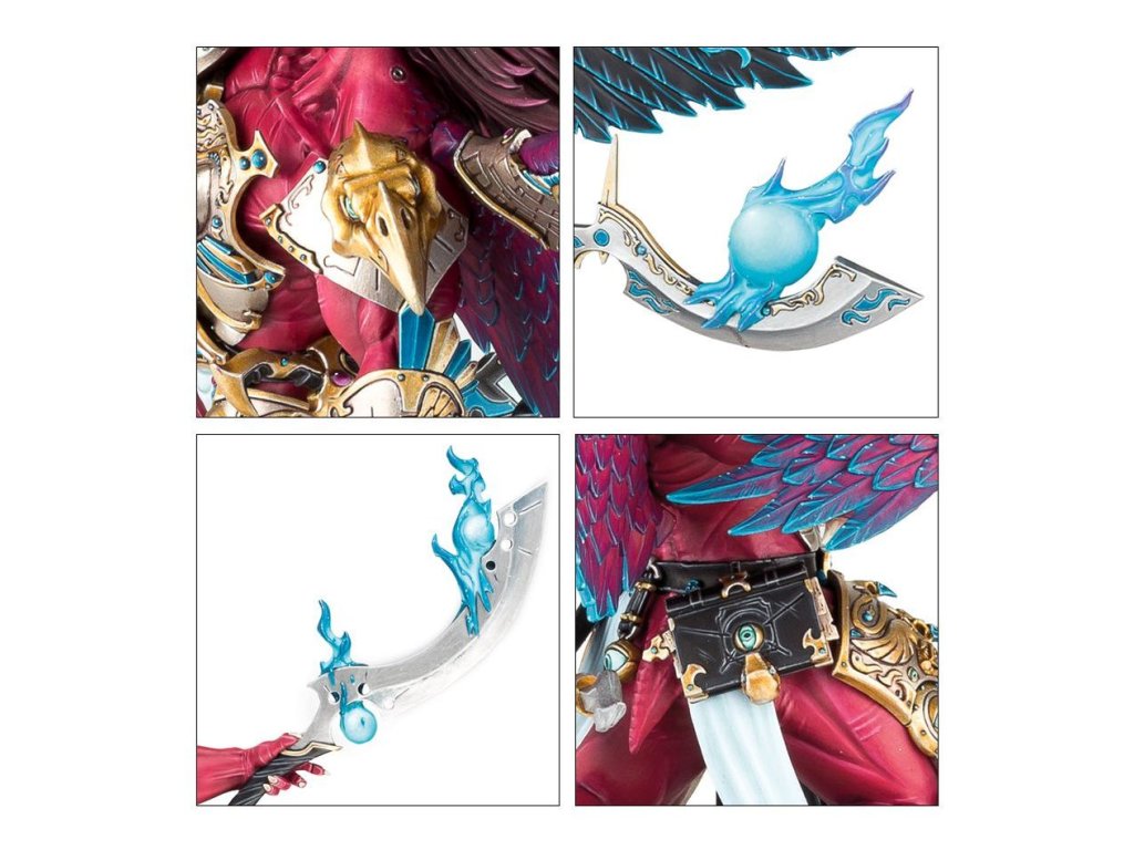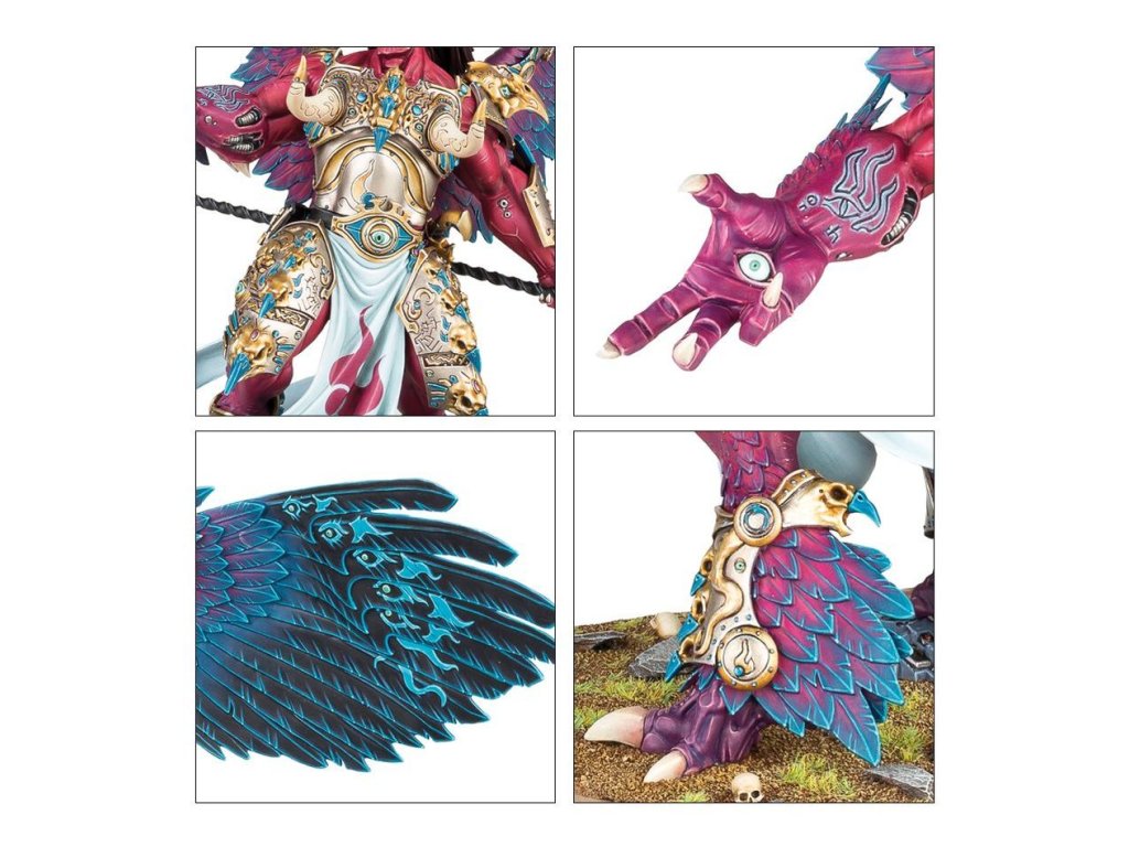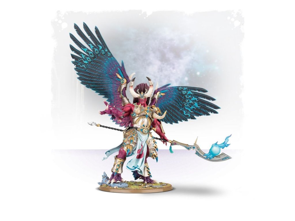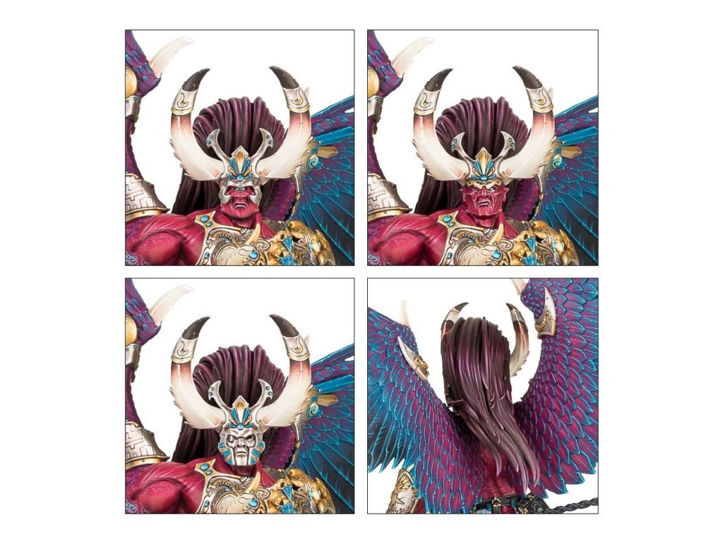 This multi-part plastic kit contains the components necessary to assemble Magnus the Red, Daemon Primarch of Tzeentch. An imposing winged model whose size is appropriate to his power, he comes with a selection of 3 different faces (cyclopean, open helm and closed helm), is clad in armour dating from before the dark days of the Horus Heresy and has an array of modelling options: accessories include magical tomes, scrolls and daggers. He’s armed with the frankly ostentatious Blade of Magnus, modelled as a choice of glaive or sword. Supplied with a Citadel 100mm Round based, and a crushed Space Wolf Dreadnought for a base detail!
