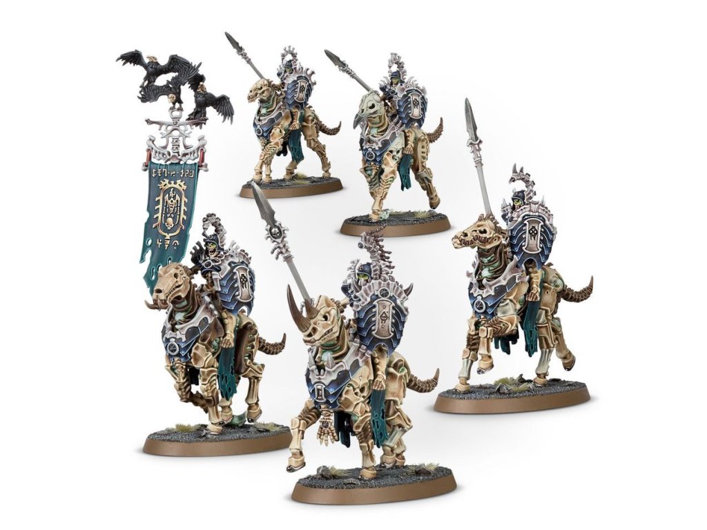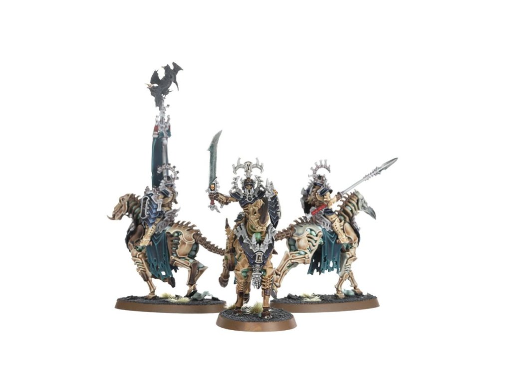 The Kavalos Deathriders can be armed with a choice of nadirite blade or nadirite spear – deadly weapons that can steal an opponent's life force. The kit also includes an option to include a Mortrek Hekatos and a Necrophoros banner bearer to lead the devastating charge.