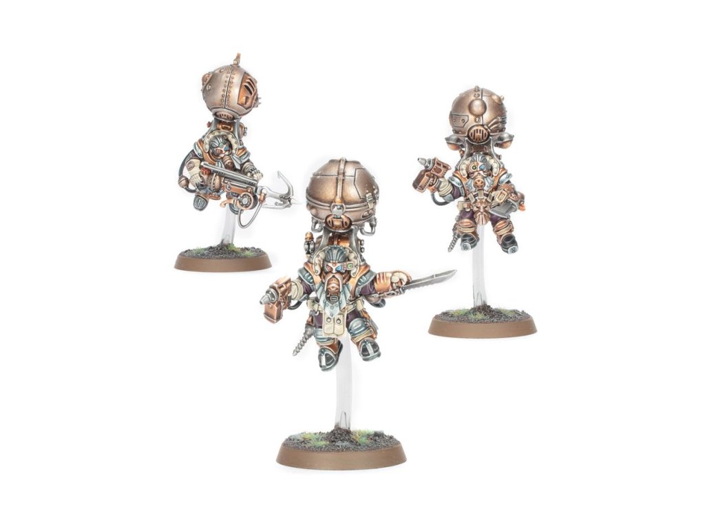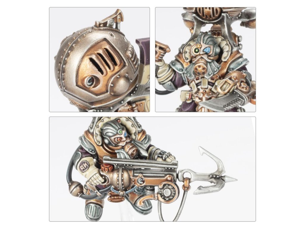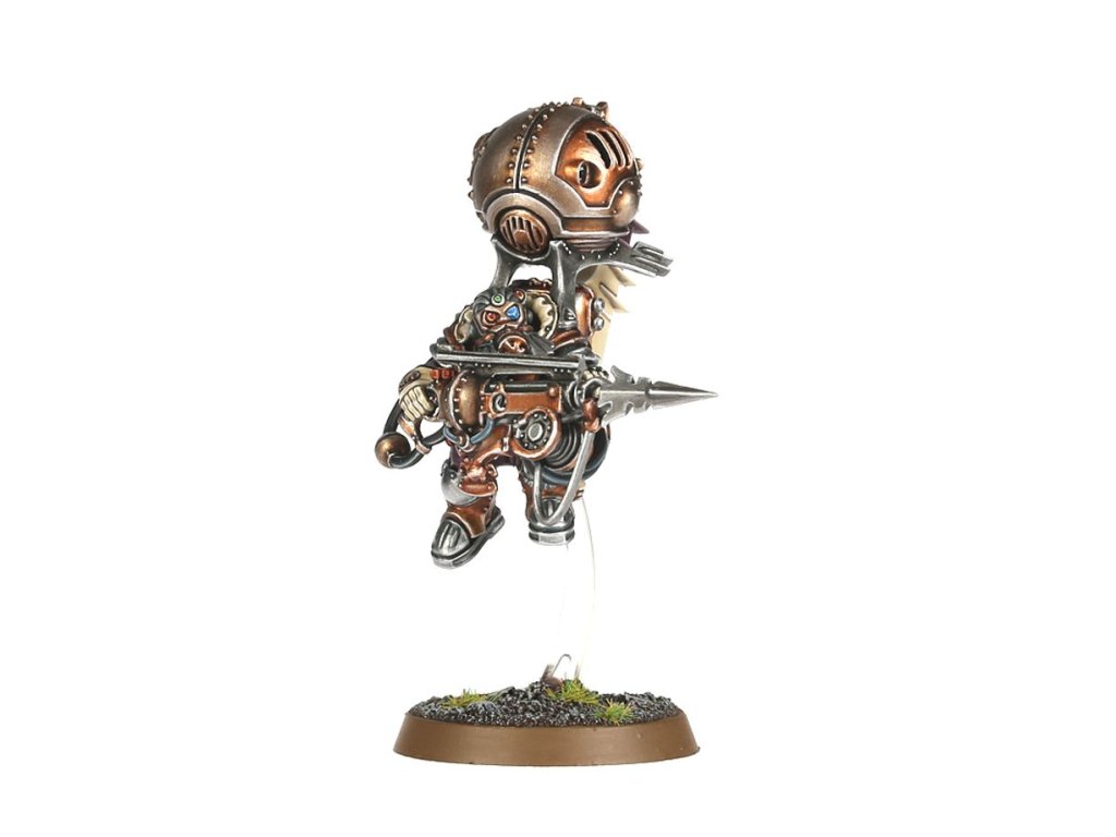 One of the Endrinriggers can be assembled as an optional champion, one can be armed with an aethermatic volley gun, and one can be armed with a grapnel launcher, skyhook, or drill launcher. The heads, aether-endrins, rivet guns, and aethermatic saws are interchangeable across the miniatures, and there are various cosmetic tools to further customise the unit. This kit can alternatively build three Skywardens – skypike-wielding airborne Arkanaut warriors.