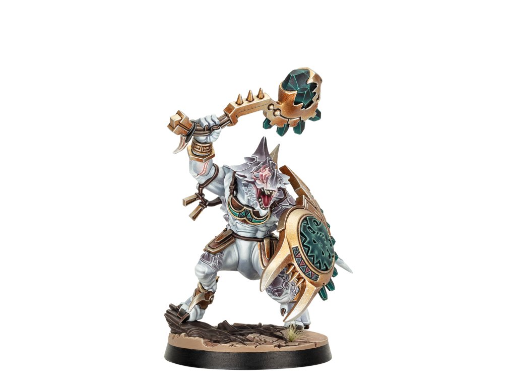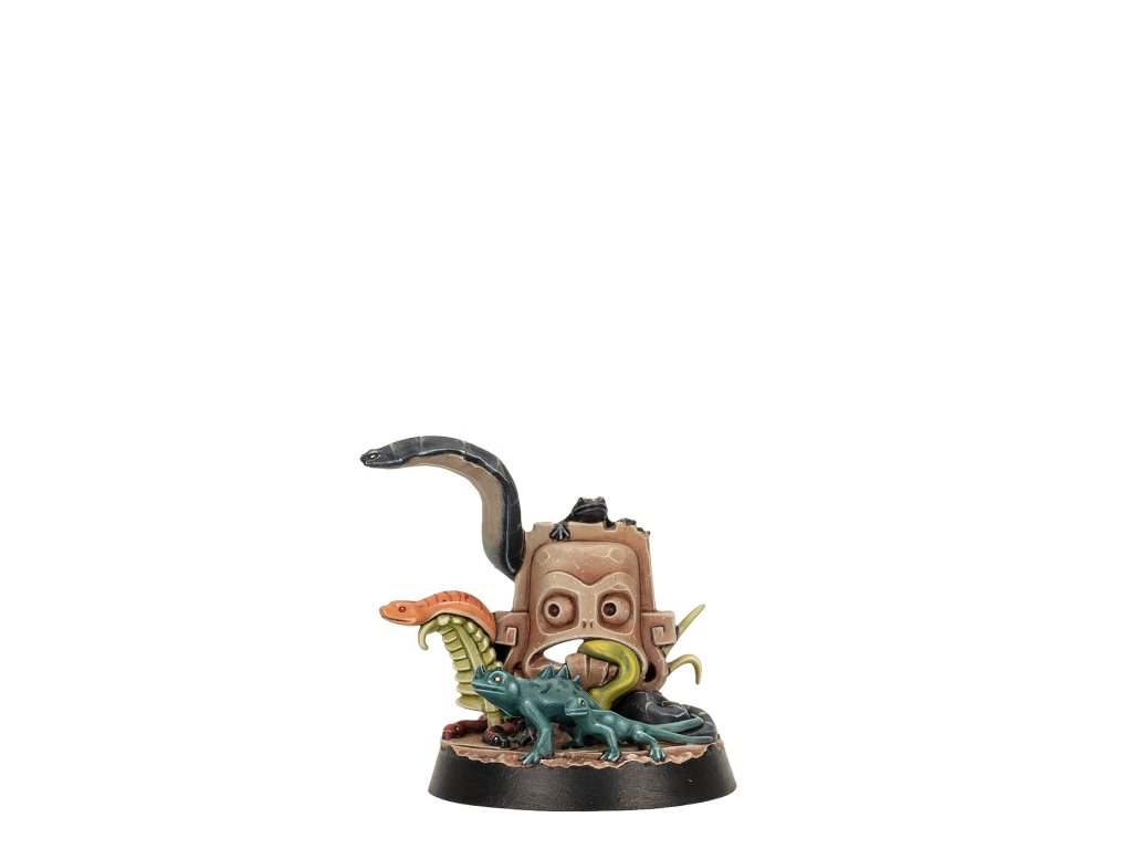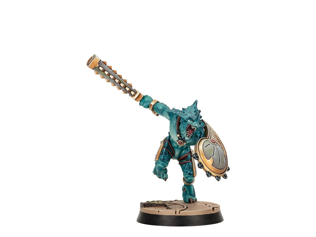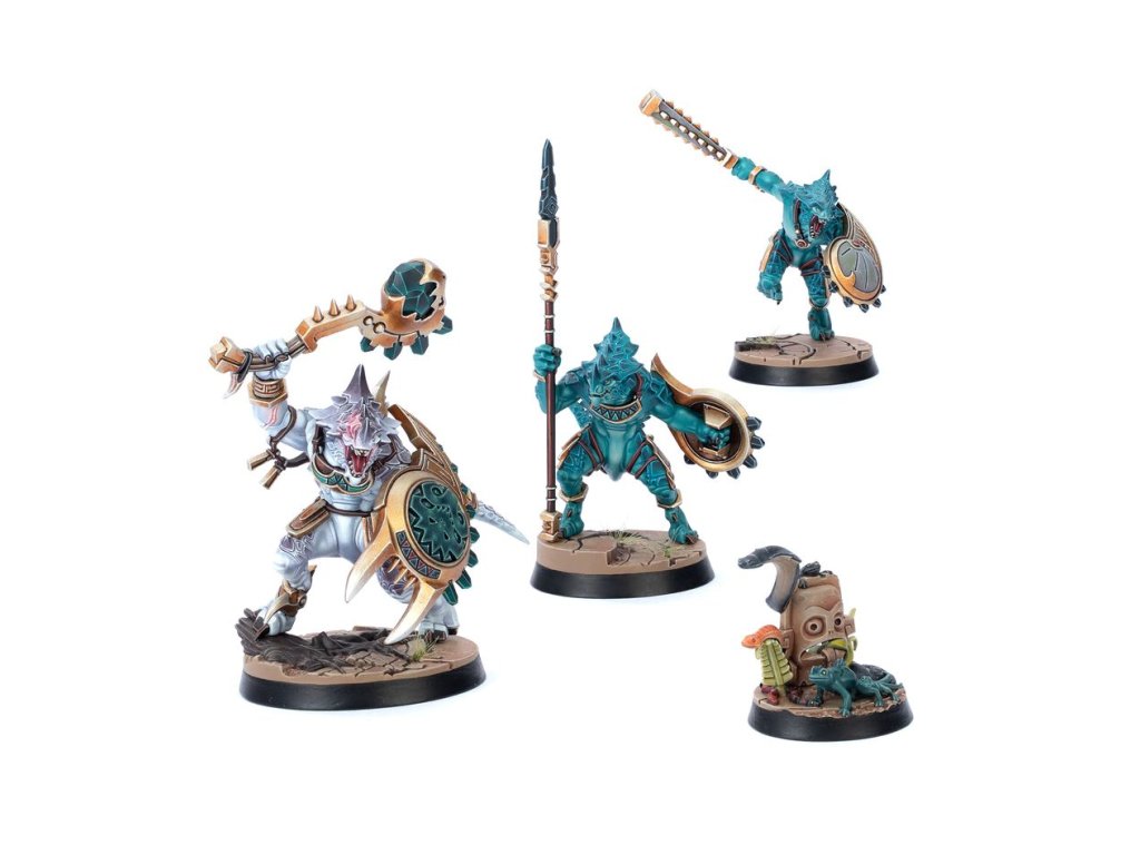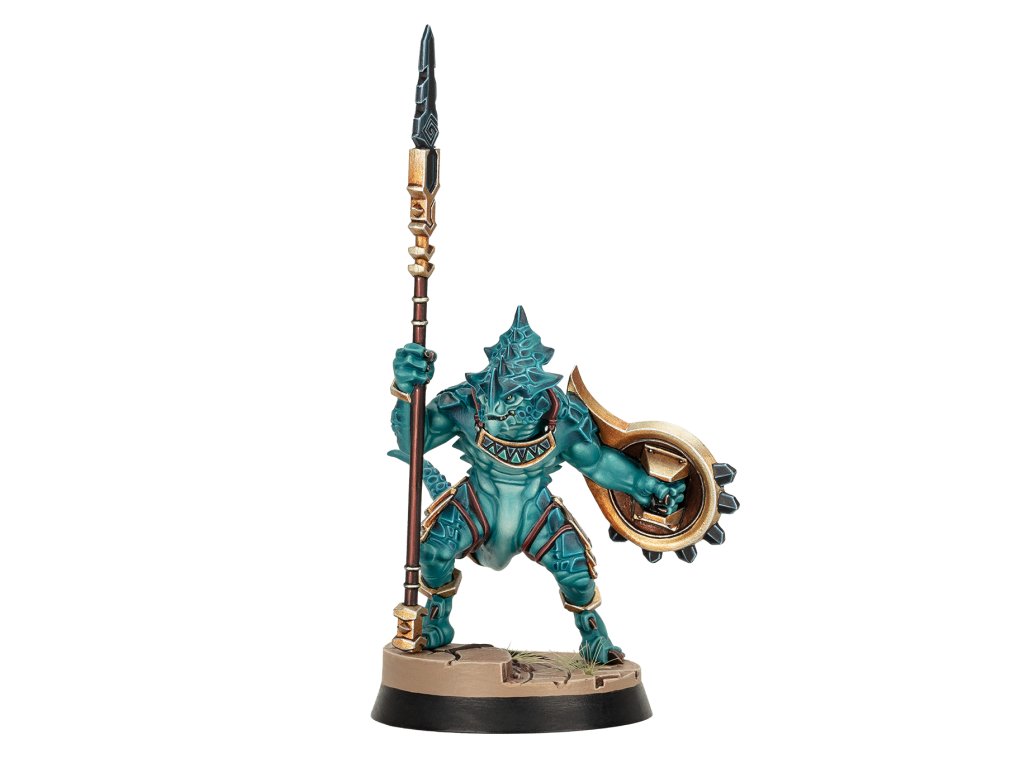 Saurus Oldblood Kro-Jax, the Aegis, leads this savage Seraphon warband across Embergard. Two brutal Saurus unleash their reptilian rage by his side – mace-wielding So-Kar, and the terrifying Ro-Tak, the Guardian, with their long-spear. These three mighty warriors are accompanied and assisted by a congregation of small venomous creatures known as Sotek's Venomites.