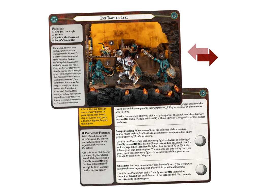 This kit includes a full Jaws of Itzl warband for use in games of Warhammer Underworlds, along with fighter cards and warscroll cards for the warband.